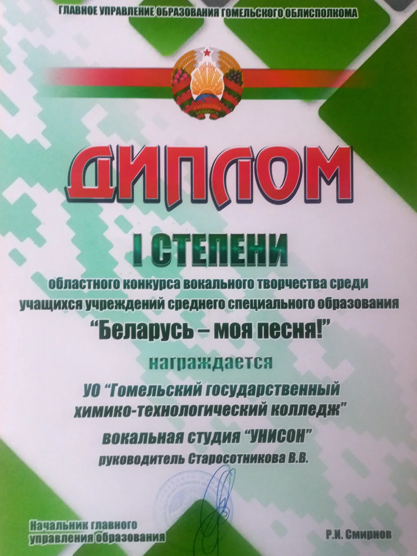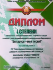 Были подведены итоги областного конкурса вокального творчества среди учащихся учреждений среднего специального образования «Беларусь — моя песня!» По итогам конкурса учащиеся нашего колледжа (вокальная студия «Унисон») получили диплом І степени. Руководитель студии — Старосотникова Вероника Владимировна.